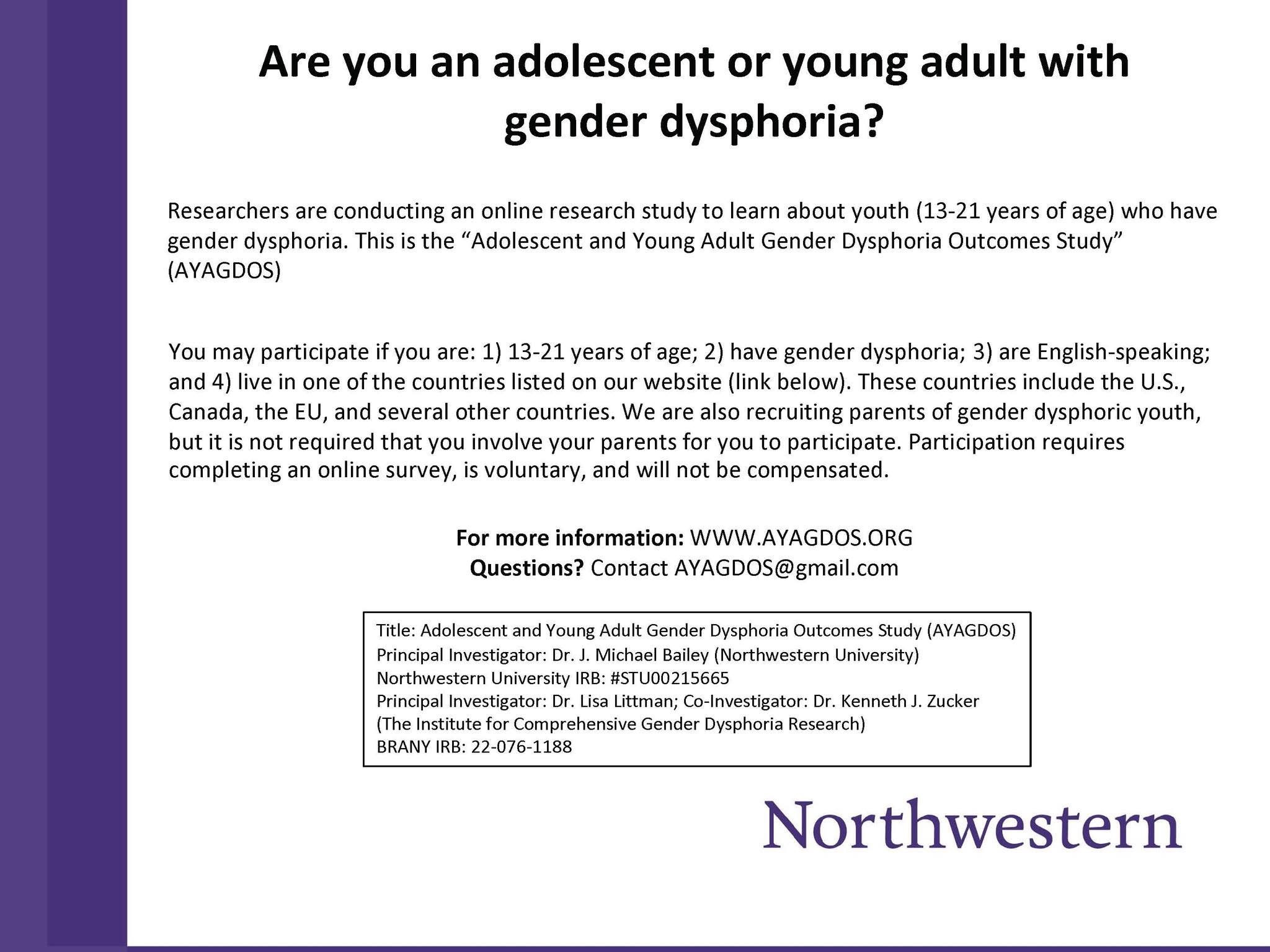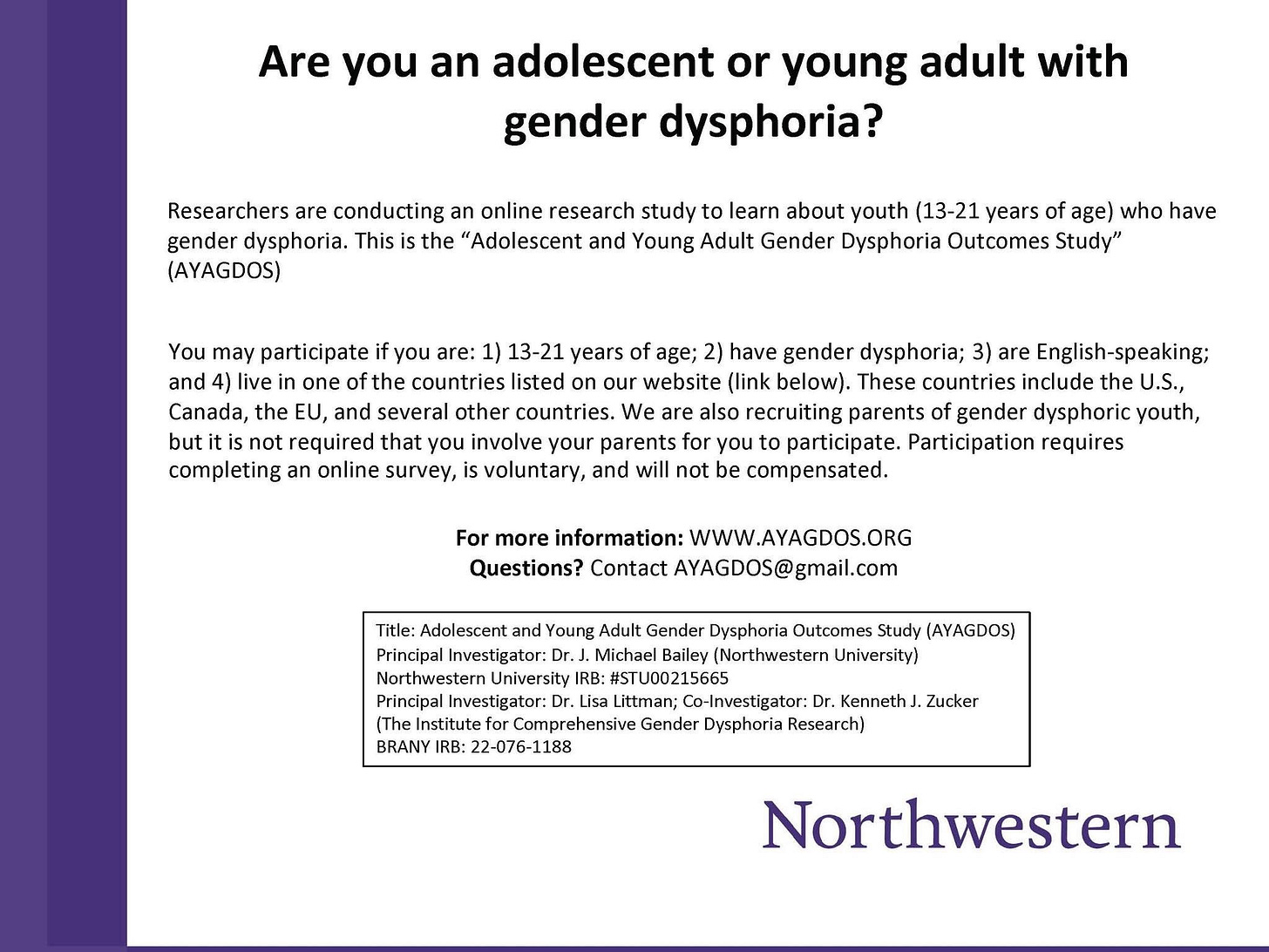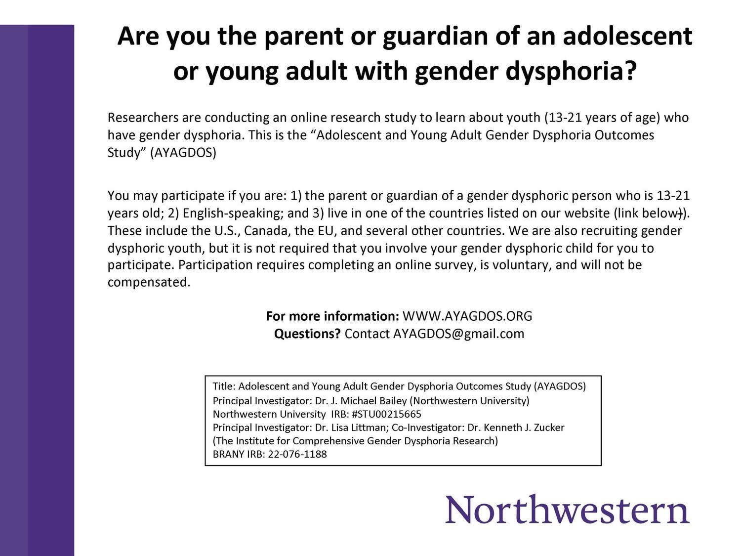 The AYAGDOS study is led by J. Michael Bailey of Northwestern University, Lisa Littman, and Kenneth Zucker.
